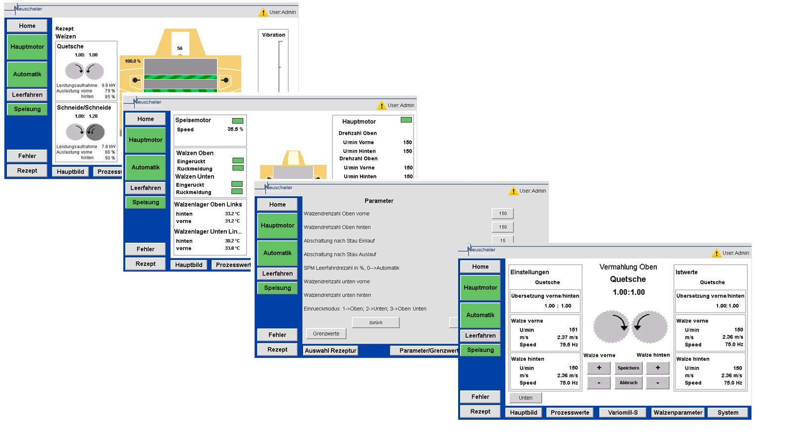 Unsere Walzenstuhlsteuerung setzt die bewährte Neuscheler Elektrotechnik-Technologie konsequent fort. Visualisierung der Prozesswerte, einfache Bedienbarkeit und Parametervewaltung. Temperatur und Vibrationsüberwachung, Ihnen fehlt etwas, fordern Sie Uns heraus!- Parameterverwaltung